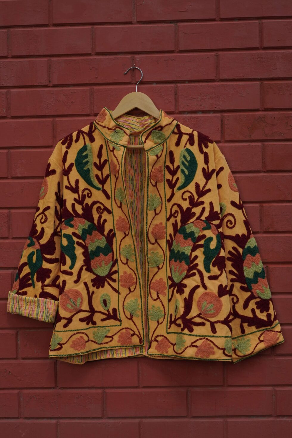Womens Yellow Velvet Embroidered Jacket with Floral Design